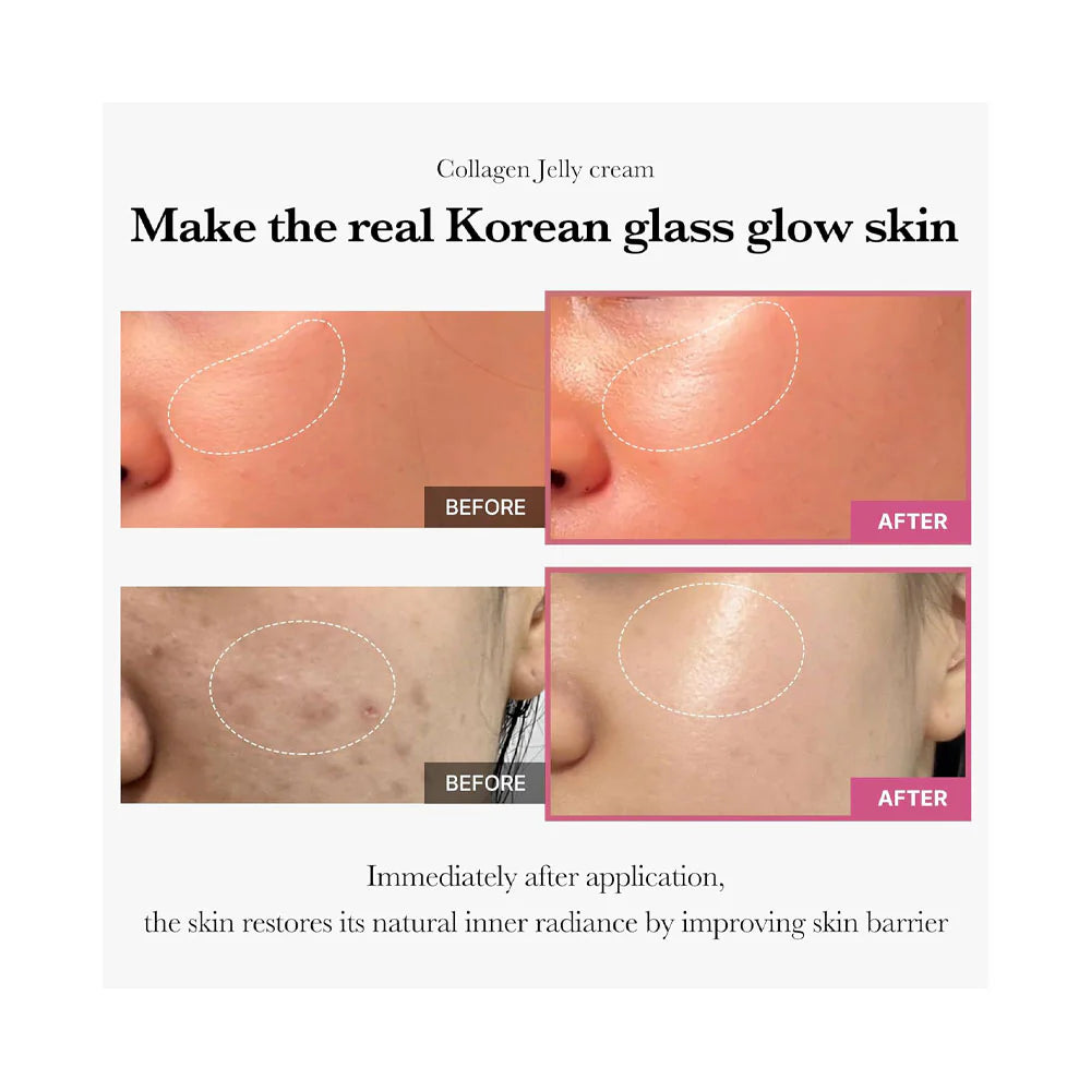 This transparent jelly cream features 'freeze-dried' hydrolyzed nano collagen that absorbs deeply to improve skin firmness and boost elasticity. It also contains niacinamide (vitamin B3) to even texture and tone, along with hydration-boosting squalene and elastin to fortify the skin’s healthy barrier, lock in moisture, and promote a soft, supple complexion that glows from within.